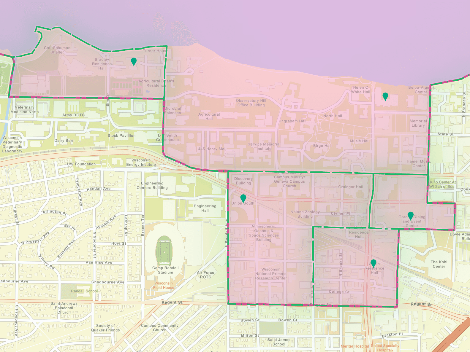 If you live in the pink highlighted area, congratulations! You live in Alder District 8. Your ward determines your polling location, and is outlined in dashed green. Green markers indicate polling location for each ward.